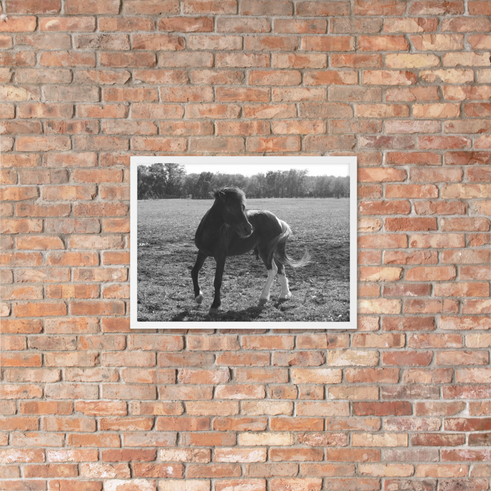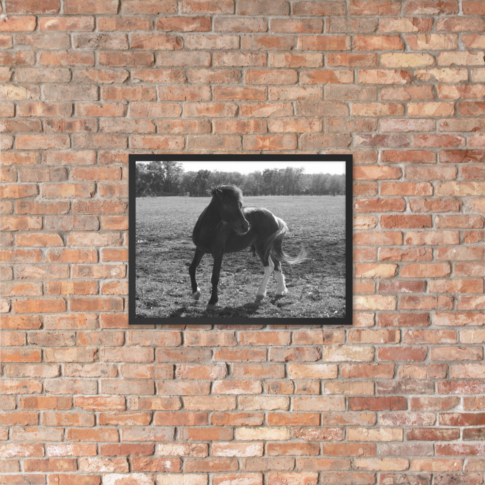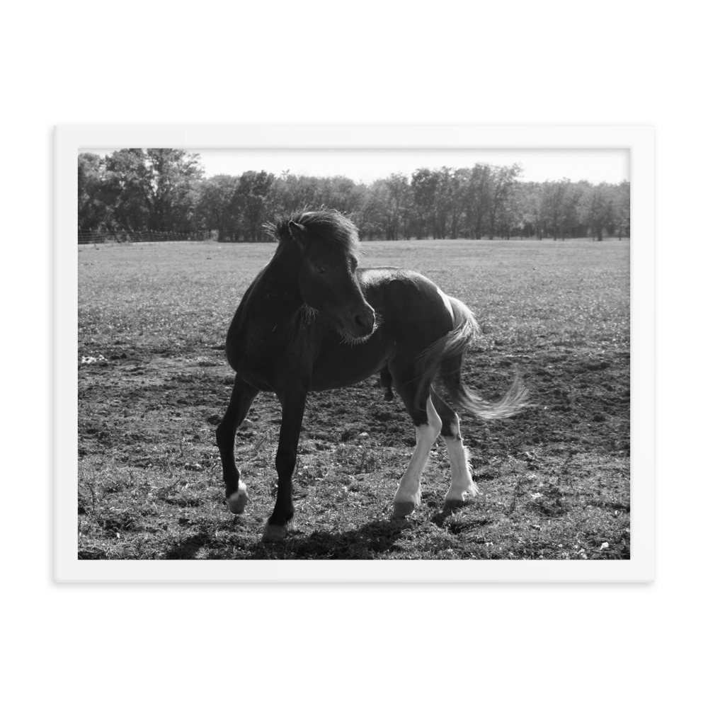 Make a statement in any room with this framed black and white print of a young colt prancing in a field. Printed on premium, high-quality, lustre paper, with a partly glossy, partly matte finish.