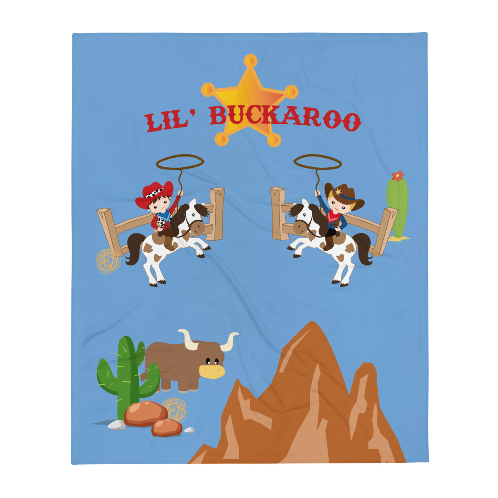 Cute cowboy ropers on this soft silk touch blanket will add western flair to a child’s room. Perfect for travel or cuddling up for a movie with family. Personalizing this colorful blanket will make him feel extra special! Send email to replace “Lil’ Buckaroo” with child’s name. Coordinates with the Lil’ Buckaroo pillows and pillowcases. Blanket measures 50 in x 60 in.