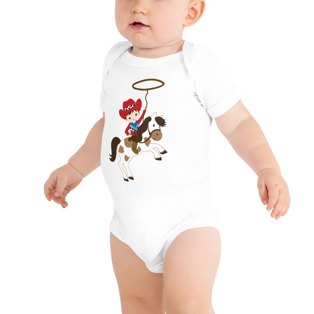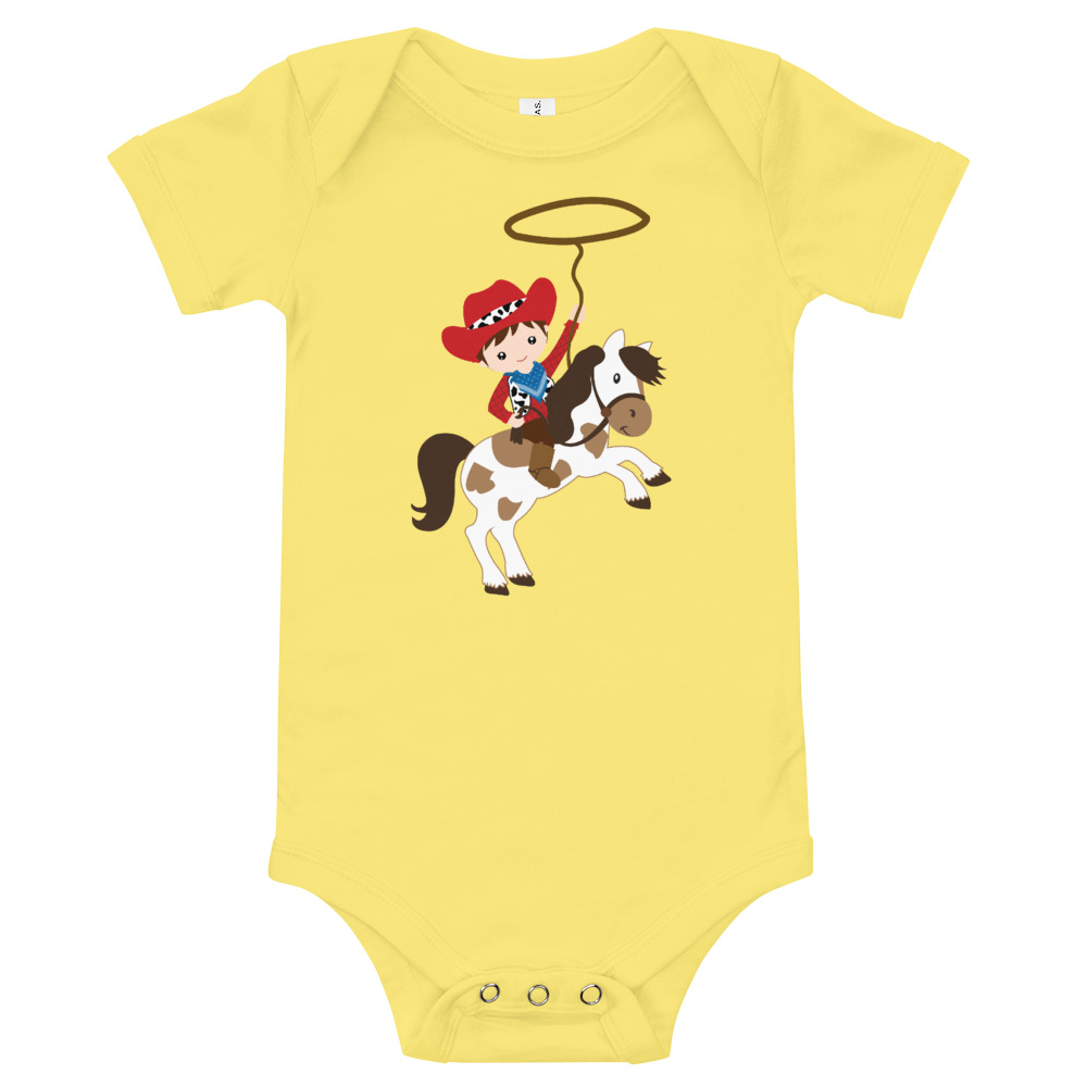 Dress your baby to the nines with this 100% cotton one piece. It has three snap leg closure for easy changing, a comfortable envelope neckline, and a little cowboy print that’s bound to get your baby all happy and giggling. Available in white and yellow. Coordinating bibs available. Blue is temporarily out of stock.