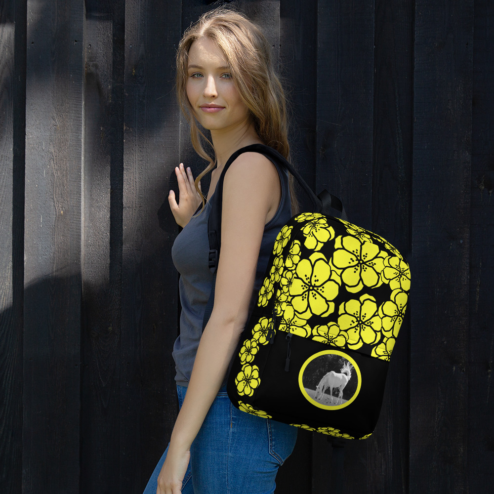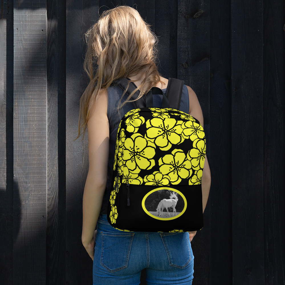 The front pocket displays a fairytale image of a beautiful white horse swishing her tail, while the inside pocket is patterned with the “Stand Strong” image on a bright yellow background. “Eph. 4:2″ is printed on the right side panel. Customization is available. Add initials, graduation year, etc. Email request prior to ordering.