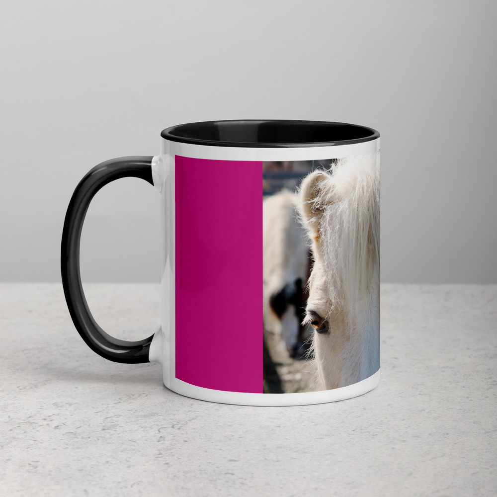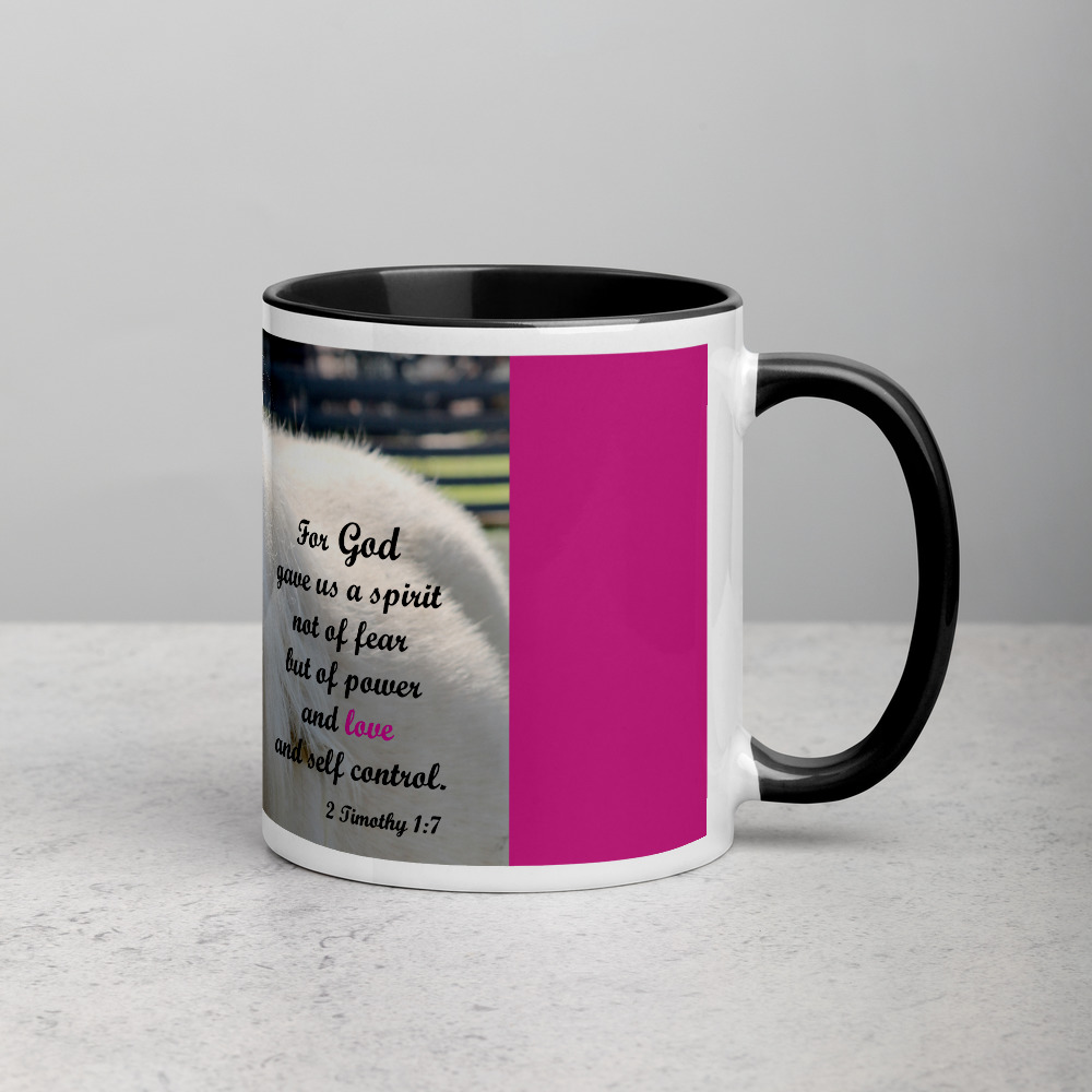 A beautiful Welsh pony on this ceramic mug comes with a reminder of our strength from the verse 1 Timothy 1:7. Trimmed in pink with a black rim, handle, and inside, bringing a touch of class to your mug rack.