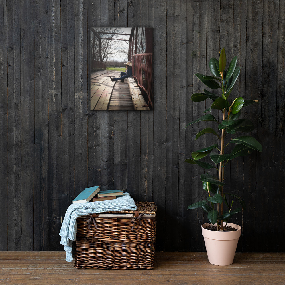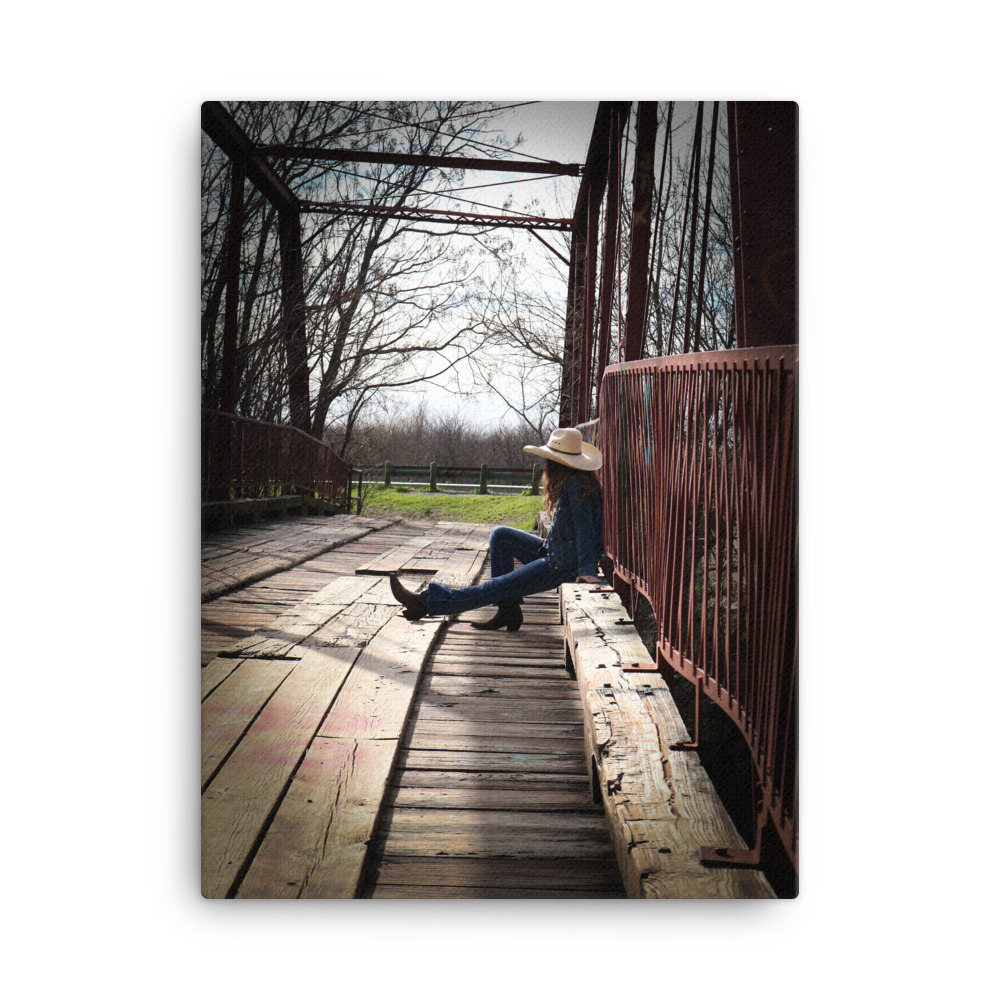 Create a peaceful feeling with the “Reflect” canvas of a young cowgirl on the Old Denton Bridge. A gentle reminder to slow down and enjoy your day. This vivid, fade-resistant print will compliment your rustic decor in any room.