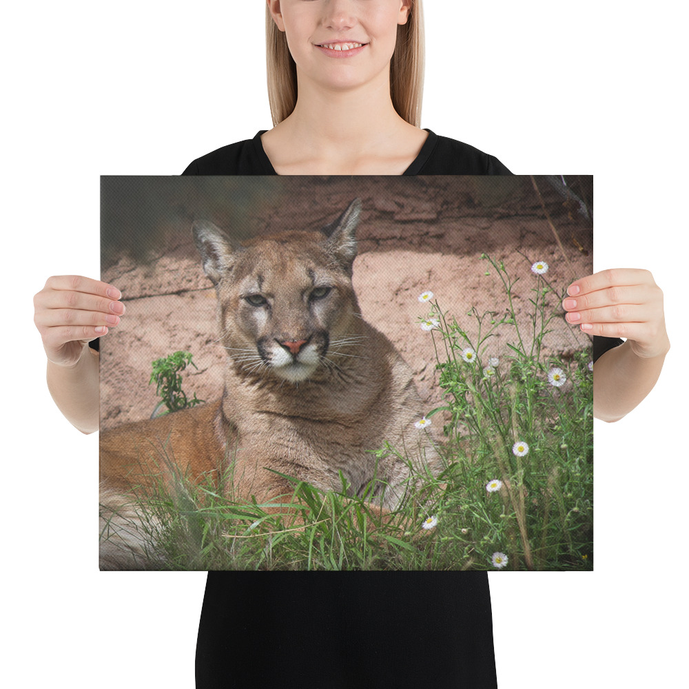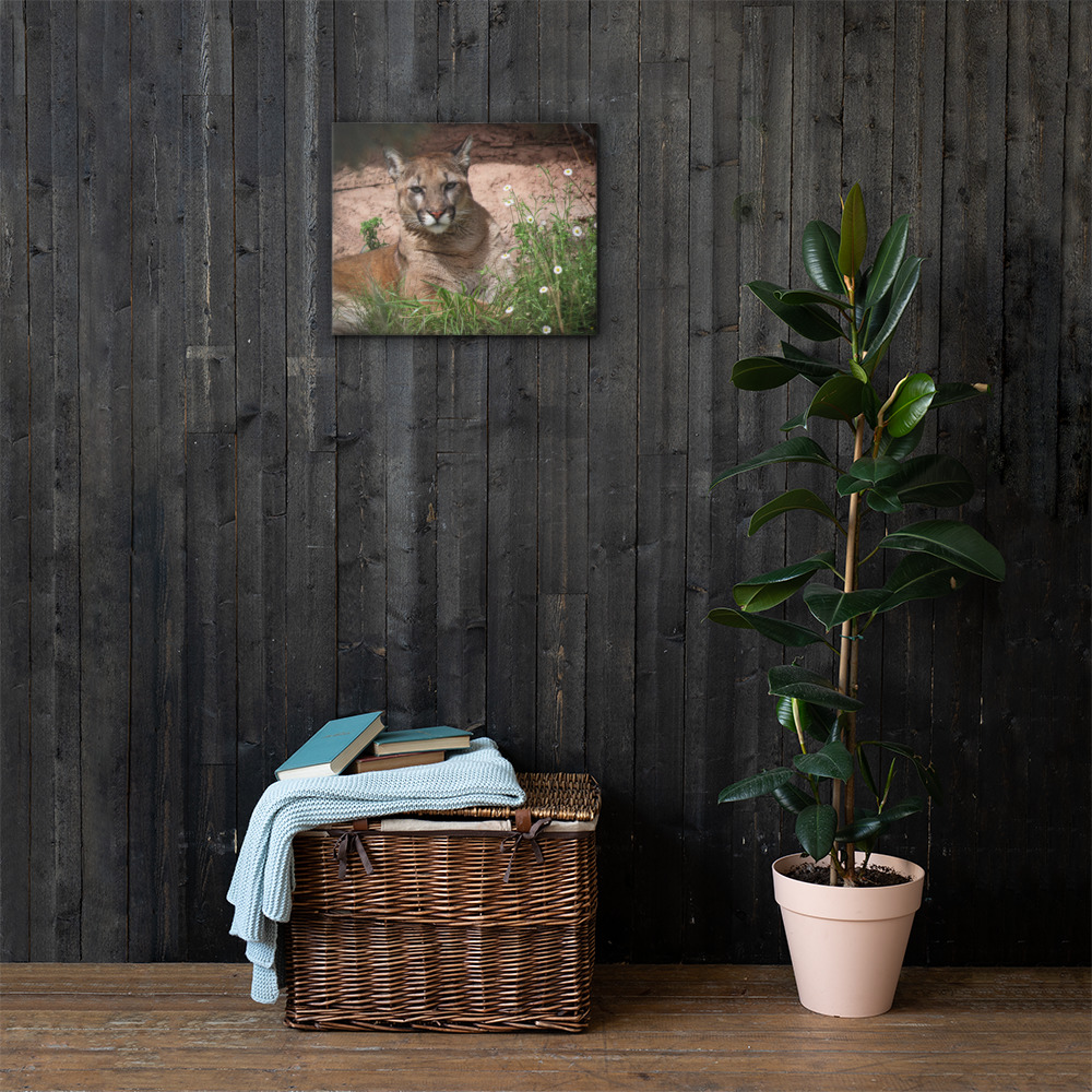 Looking to add a little flair to your room or office? Look no further – this canvas print has a vivid, fade-resistant print that you’re bound to fall in love with. Museum wrapped canvas of a beautiful mountain lion laying among the daisies. Taken in Tucson, Arizona.